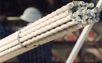 Tillco's FRP Rebar is manufactured using the pultrusion process, a machine method of producing continuous composite profiles with high strength and close dimensional tolerances. Glass and synthetic filaments saturated in polymer resins are pulled through steel dies that shape the profiles and control the reinforcement to matrix ratio.
